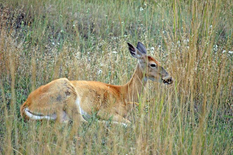 As I proceeded along the road toward the exit of the bison range, I saw this doe resting in the grass and stopped to take a picture. It was then I noted the other deer in the area and took the picture which was to be the front of this year's Christmas card.