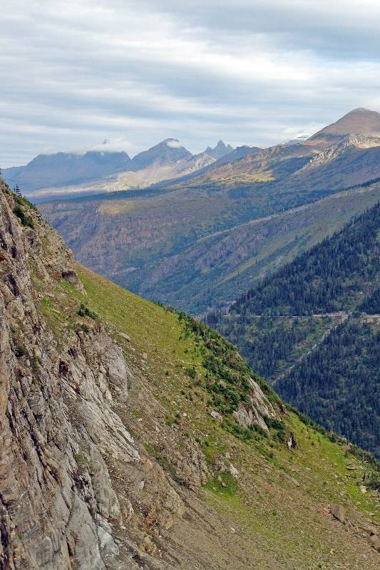 This view is from an observation area just to the west of Logan Pass. Logan Pass is the point at which Going to the Sun crosses the Continental Divide. The ridge of mountains on the right had side is called the Garden Wall. You can also see some of Going to the Sun road.
