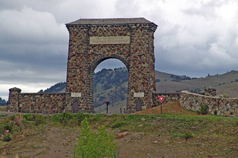 The Roosevelt Gate at the North Entrance marks the original entrance into Yellowstone National Park. Today there are four other entrances, West, South, East, and Northeast. The Gate is near Gardiner, Montana, just north of Mammoth Hot Springs. The words at the top, "FOR THE BENEFIT AND ENJOYMENT OF THE PEOPLE" are from the act which made Yellowstone the nation's first National Park.